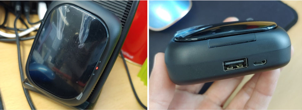 기존에 스마트폰 충전기로 쓰던 무선 충전기 위에 올려보니까 바로 충전이 됩니다 빨간색 불이 깜박깜박 하고 있는건 충전중이라는겁니다. 후면에는 USB 단자와 5핀 단자가 있는데요 이 케이스 안에 내장 배터리가 있어서 보조 배터리로도 사용할 수 있다고 합니다 우측 마이크로5핀의 경우에는 충전을 위한 케이블 연결을 하면됩니다.